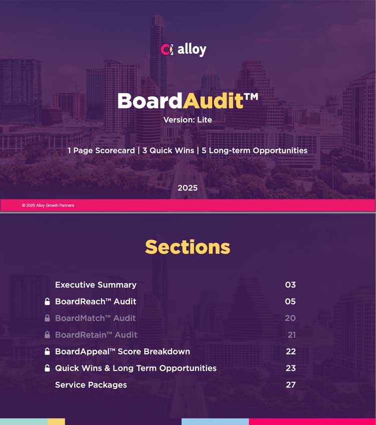This is a Lite Audit. It’s a snapshot of how you show up in AI search results, Google, and online reputation signals. We have a Full Audit that digs deeper — adding competitor benchmarks, content analysis, and even how your positioning looks from a board’s perspective.